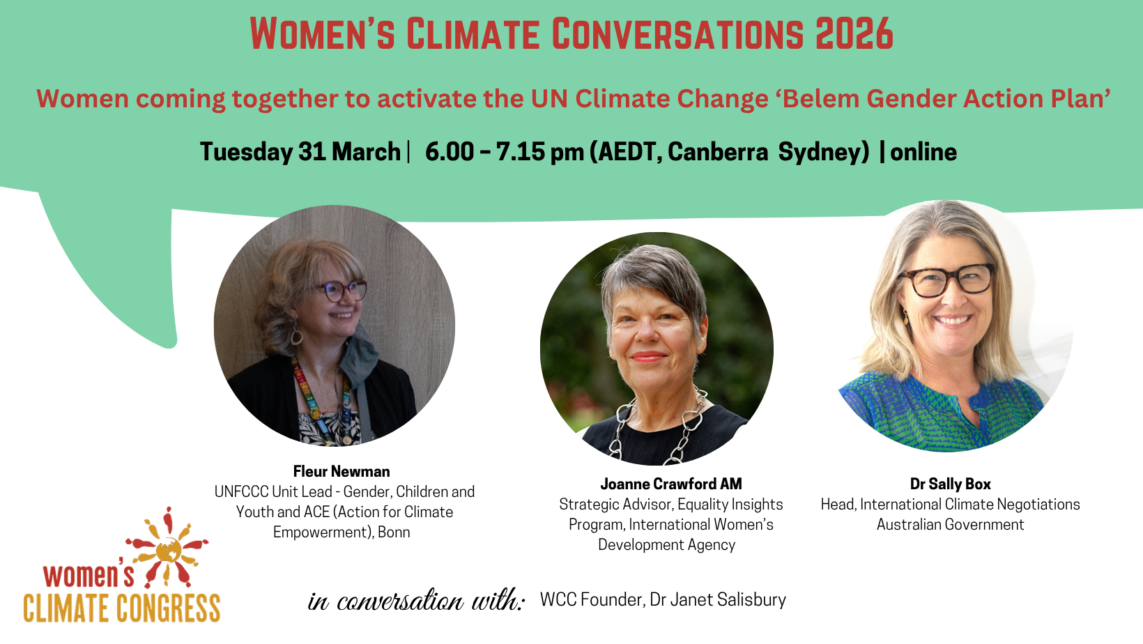 The WCC has responded by creating the first of our flagship Women's Climate Conversations online events for 2026, as an International Women's Month special event featuring Fleur Newman who is the UNFCCC Unit Lead for Gender, Children and Youth and ACE (Action for Climate Empowerment) and so was centrally involved in the development of the Belém Gender Action Plan.
